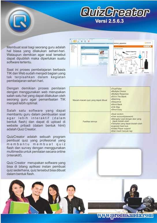 Quiz Creator adalah sebuah program pembuat quiz yang profesional yang membantu membuat quiz flash dan survey dengan menggunakan multimedia untuk penilaian secara online ( interaktif) .